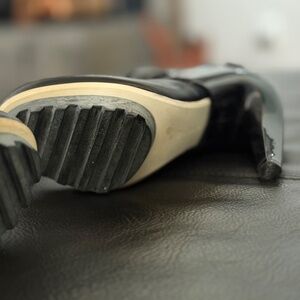 Soft leather upper combined with rubber, mesh, & neoprene details for a futuristic look