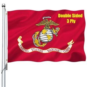 Double-sided 3-ply United States Marine Corps flag. Bold red color with emblem.