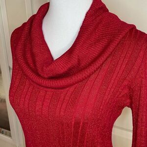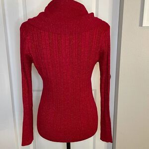 United States Sweater Red Metallic Cowl Neck Sweater size small. The sweater is form fitting but lightweight and comfortable. Looks great with flare jeans or black skinnies. Perfect for the holidays!