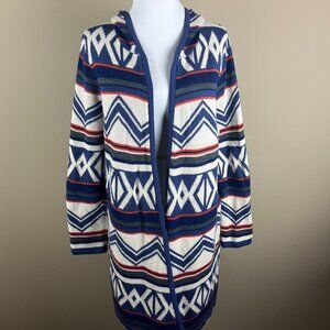 United States Sweaters Long Sleeve Open Cardigan Size L Blue Cream, Aztec Print, Hooded, Stretch