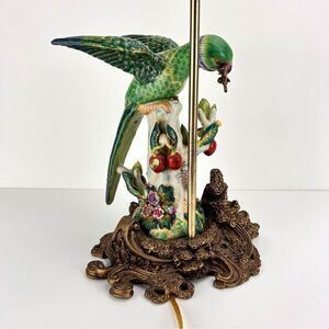 Stunning and Rare Porcelain with Bronze Mounted Parrot Lamp, Rococo Bronze Flourished Base and mounts. The hand painted bird sits on a trunk shaped base embellished with floral decor.