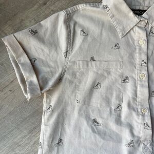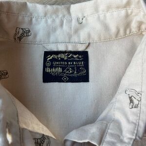 Light tan popover button down shirt from the brand United by Blue. It has a very unique hiking boot print on it in a darker brown, so this would be perfect for the outdoorswomen in your life. This women's shirt features a collar, cuffed sleeves, and two chest pockets on the front. It's a size medium; pit-to-pit measures about 19.5 inches and the length measures about 22.5 inches. The fabric tag came off, but I believe this is made of primarily hemp blended with recycled polyester. Excellent condition, no flaws, only selling because I need to downsize my closet.