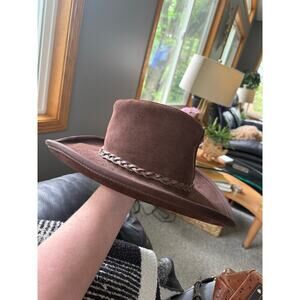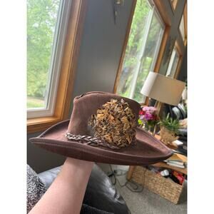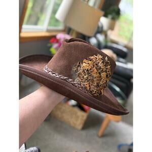 Brown suede leather hat with you feathers and braided strap detail good condition is missing a few feathers. Please see photo.