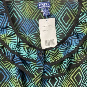 Uniti Sheer Top Womens Plus 2X Blue Black Print Button Up Ruffle Neck Blouse