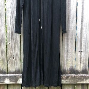 Units vintage 90’s slinky black duster. Open front with a tie at the chest. The ties have heavy metal tips at the ends. Long sleeves, slits at each side. The fabric is heavy, with a lot of stretch and a beautiful drape. Excellent condition, no flaws. Size M.