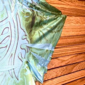 Jersey feeling tattoo print in rich jewel tones. the midriff is flowing gathered bodice.