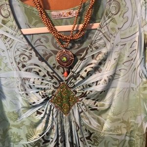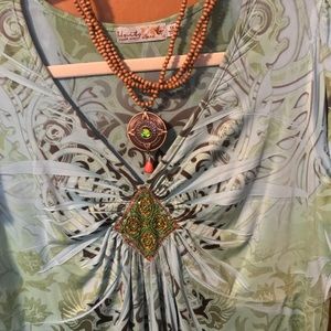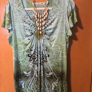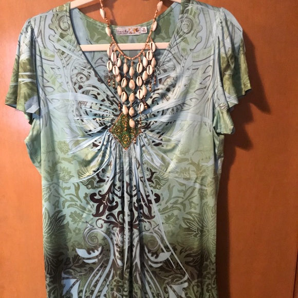 Can you tell me the material it’s made of and can I see the bottom part of the shirt because some of this brand likes to have the left and right side go longer than the middle.