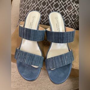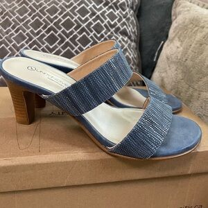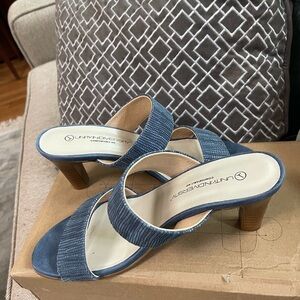 Beautiful blue sandals made by unity in diversity size 38 or 7.5 medium 2.5 inch heels very X comfortable retails $140. Style called Beguille. These were tried on only. In like new condition.