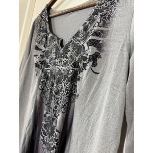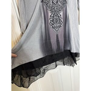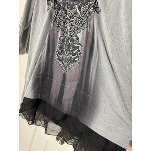 This Unity World Wear blouse features a V-neckline, 3/4 sleeves, and a semi-sheer chiffon hem. The damask pattern is accented with beads, giving it a whimsical, fairy-like look. Made of a polyester-spandex blend, this top is perfect for casual wear in all seasons. The black and gray color scheme adds a touch of grunge to the overall design. Perfect for those who love a mix of witchy and gothic styles.