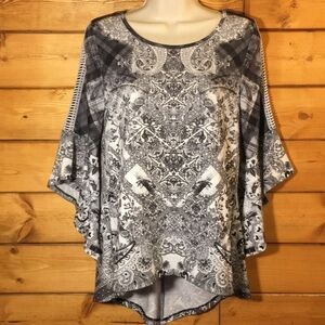 Pretty crew neck pullover top in gray and white print, 3/4 ruffle bell sleeve and hi-lo hemline. Ladder crochet lace detailing along sleeves and upper back yoke. Excellent condition. No pulling or stains. Measures approx 18” from underarm seam to underarm seam. Length is approx 25” in front to approx 29” in back. Size small.