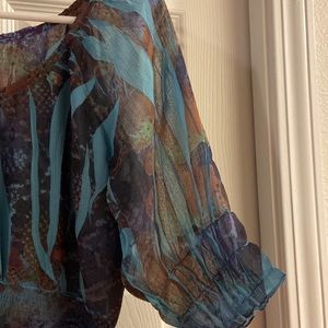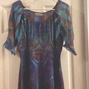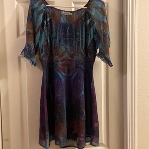 Beautiful sheer purple multi colored dress. This dress is so unique. Wear in the summer over bath suit its’s completely sheer or wear our day or evening. It seems so versatile, I love this dress. It has a unique pink flower pattern on the front, pops of bright blue and dark purple. There is also a snake pattern as well up close and also tiger eyes at the bottom as you look closer. Cool pattern 🌻😊