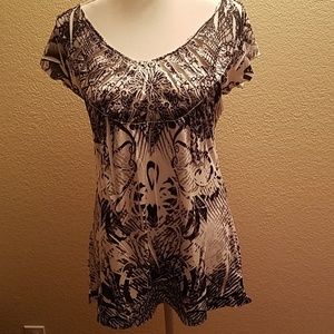 Unity top in black, white, and grey print in petite large. Does not look like a petite or a large size, looks like a medium size, regular length. Bust area is lined. Never worn. 100% polyester.