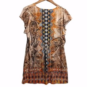 Stylish long tunic with Azteca designs. Pretty beaded design cinched at chest. Would go great with leggings! XL plus size! Ships fast with tlc.