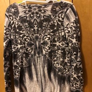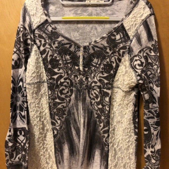 Beautiful Unity World Wear shirt with lace and interesting print. Has been worn and loved, but still looks great. Enjoy!