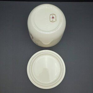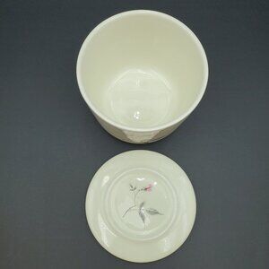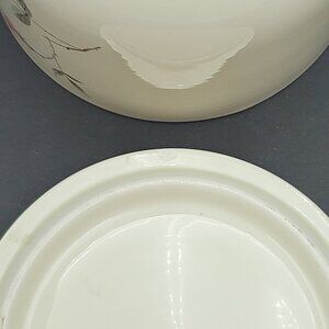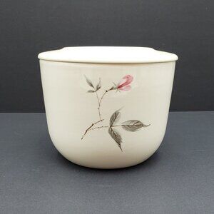 Universal China Company Ballerina Rosette Refrigerator Jar Lidded Bowl Canister Drip Jar Refrigerator Dish. Delicate pink rose floral with gray leaves pattern on an off-white lidded dish. The dish is in excellent pre-owned condition. The lid is very good with a small chip but on the underside of the rim not visible from above - see last photo. 5-7/8" across the top and 4.5" deep without the lid. Versatile vintage piece for use or display.