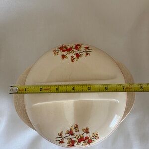 Vintage Universal Cambridge National Brotherhood Potteries Bittersweet Casserole Dish Red berries Cottage core country decor made in USA.This is a vintage large casserole dish with lots of crazing, stains, and discoloration throughout due to its age, please review pictures for details. It is part of the bittersweet collection from universal Cambridge national brotherhood potteries. Beautiful creamy beige color with red berries design on all sides and top of lid.