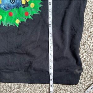 Black sweater with a festive Minion design. Features a Minion wearing a Santa hat surrounded by a green wreath.