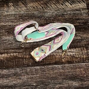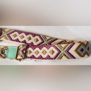 Stylish strap with geometric pattern. Features pink, green, and cream colors. Perfect for bags.