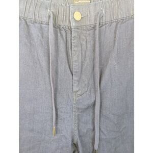 Universal Standard Dark Indigo Comfort Denim Drawstring High Rise Tapered Jean. Front pockets, back pockets functional once stitching is undone.