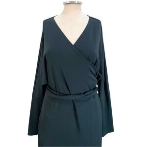 Features: Stretch jersey fabric in a deep dark green. V neckline. Long sleeves. Midi. Wrap style closure.