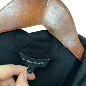 This Universal Standard Fine Dress features a black asymmetrical midi silhouette with a button-down shirt design, crafted in a structured cotton blend for versatile wear.
