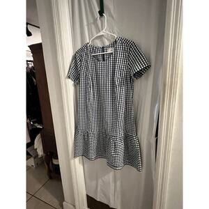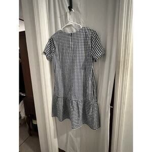 This J.Crew dress in size small is a must-have for any wardrobe. The gingham pattern in blue and white is perfect for a classic, preppy look. The dress features a round neckline, short sleeves, and a zip closure. It's made of a cotton, nylon, and spandex blend and is machine washable.