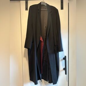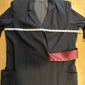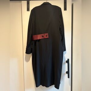 Black jacket with burgundy obi-style belt detail, pockets. Universal Standard size M = 18. PTP (when buttoned) ~23”, collar to hem 47”. Great used condition, love how easy it is to dress up or wear more casually.