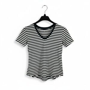 This Universal Standard V Rex V-Neck Tee in Scarab/Bone Stripe delivers the perfect mix of softness, stretch, and everyday polish. Crafted from a premium blend of 48% cotton, 48% modal, and 4% elastane, it feels luxuriously smooth and breathable with just the right amount of stretch. The short sleeves, flattering V-neckline, and curved hem create a timeless silhouette that flatters every shape.