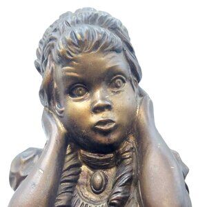 These vintage Universal Statuary figurines depict a boy playing jazz and a girl covering her ears. Crafted in Chicago, they exude nostalgic charm.