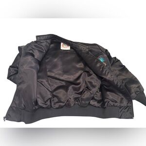 The Universal Studios Hollywood 30th Anniversary Vintage Bomber Jacket is a black satin jacket with a retro bomber/Harrington look, perfect for casual occasions in the 1990s. Made in the United States, this original piece celebrates the iconic brand's history from 1964 to 1994. This vintage jacket in regular size exudes a classic style with a touch of nostalgia, ideal for men's outerwear collections.