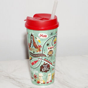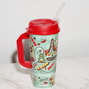 Universal Orlando Theme Parks Handle Reusable Freestyle Drink Refill Cup, older style with handle, straw, and lid.