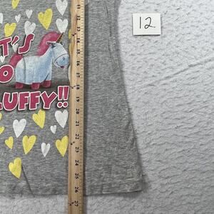 Brand new with tags Universal Studios Despicable Me short sleeve v-neck graphic tee shirt in a women's size small in gray with a printed design on the front of Agnes' Unicorn with text that reads "It's So Fluffy". Made up of a polyester and cotton blend.