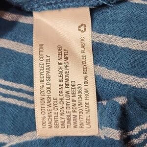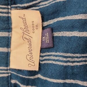 Size 1X Teal striped, lightweight button up top by Universal Thread. 2 very small snags, and a tiny spot that is hardly noticeable (see photos). Button up front and on sleeve.