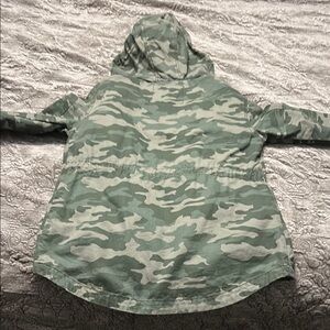 Women’s zip jacket with hood and front pocket detail. Also has an adjustable string to cinch the waist.
