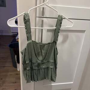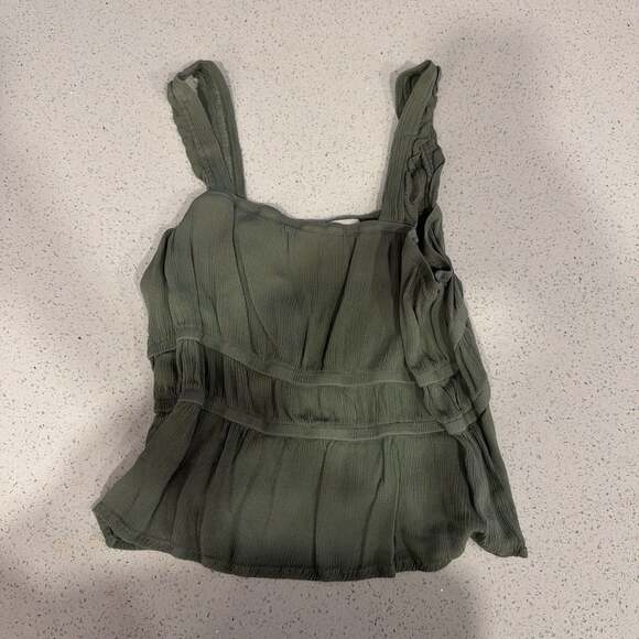 This Universal Thread cami top in olive green features a smocked bodice and tiered ruffle hem, offering a comfortable and stylish fit. Perfect for warm weather or layering, this versatile piece can be dressed up or down. The breathable fabric ensures all-day comfort. Excellent pre-owned condition, no visible flaws.