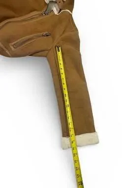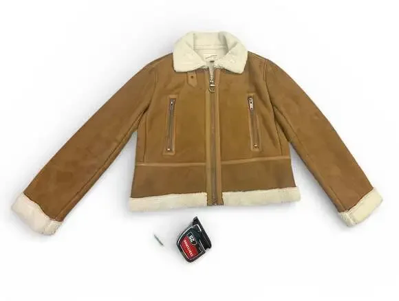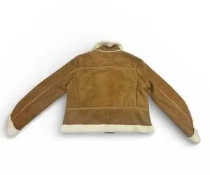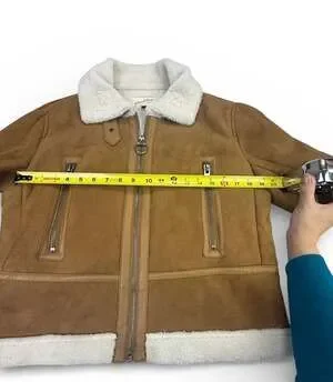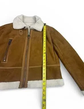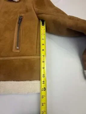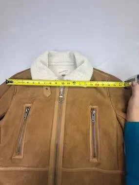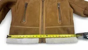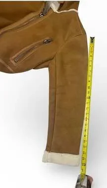 Universal Thread Brown Faux Suede Sherpa-Lined Aviator Jacket, Women's Size Small. This stylish moto-inspired jacket features a warm white sherpa collar, hem, and cuffs. Designed with a full zip front and functional side zip pockets. Made from 100% polyester coated fabric for a suede-like finish without the leather maintenance. Excellent pre-owned condition with no visible flaws. Perfect for layering in cold weather. Measurements: Pit to pit approx 19.5\", length approx 21\", sleeve length approx 22\".