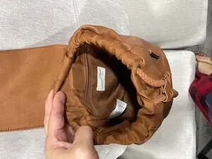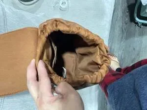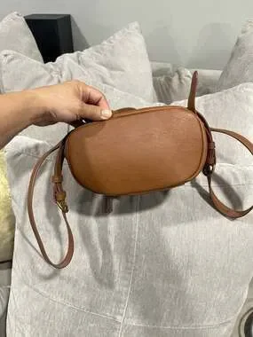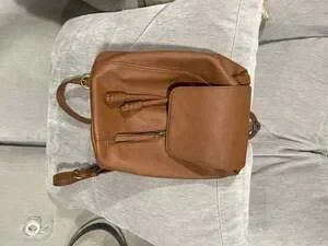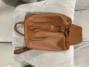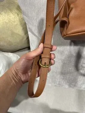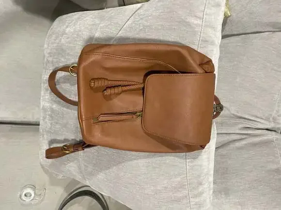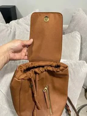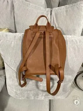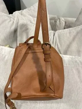 Universal Thread Brown Faux Leather Mini Backpack. This stylish and practical bag features a soft cognac brown vegan leather exterior with a drawstring cinch closure and a magnetic snap flap.