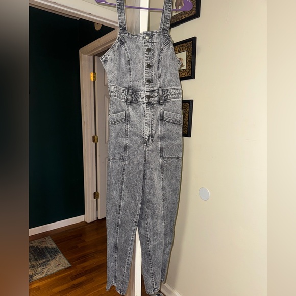 Sleeveless denim jumpsuit with button-up front. Features a chic gray wash.