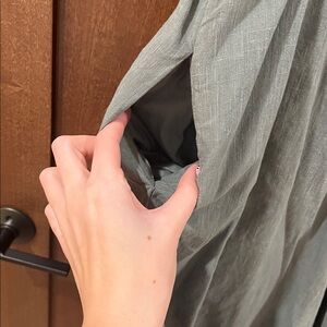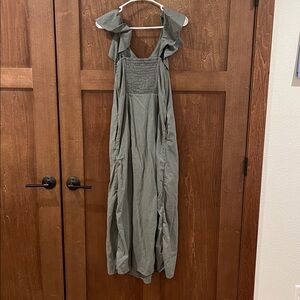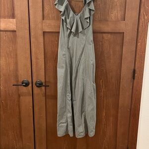 Backless women's dress with deep V and layered ruffle trim. Soft sage green fabric with subtle texture. Sleeveless, airy silhouette for warm days. Feminine, easy-to-style look for casual or dressy occasions.
