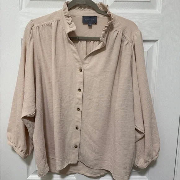 Elegant beige blouse with a ruffle neckline and button-down design. Perfect for any occasion.