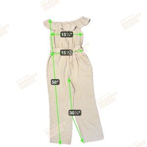 Chic beige jumpsuit with ruffle neckline. Features a tie waist for a flattering fit. Ideal for versatile styling.