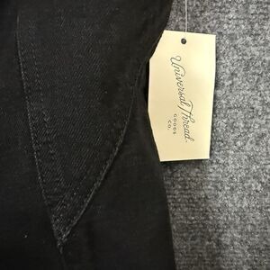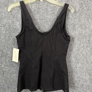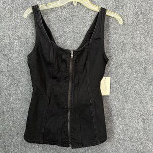 The Universal Thread Black Denim Corset Top in size 0 is a stylish and versatile addition to any woman's wardrobe. This full zip front top features a hip-length design with double zipper for added detail. Made from a blend of spandex and cotton denim, this top is machine washable for easy care. Perfect for various occasions, including travel, parties, or casual wear, this extra-slim fit tank top in a solid black color adds a touch of sophistication to any outfit. Perfect for any season, this top is a must-have for fashion-forward individuals.
