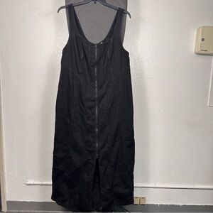 Chic black midi dress with a front zipper. Sleeveless design. Perfect for versatile styling.