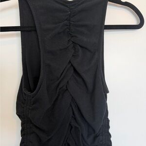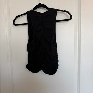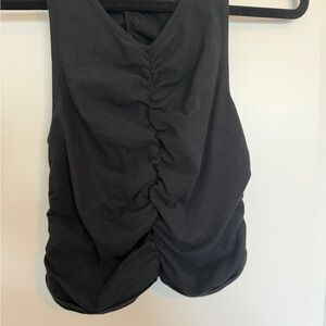 Chic black muscle tee with ruched front. Sleeveless design. Versatile and stylish.