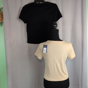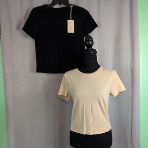 Chic short sleeve tees in black and cream. Ideal for casual wear or layering. Elevate your style effortlessly.