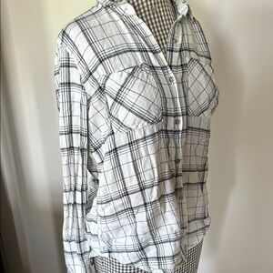 Stylish plaid shirt with button-up design. Features dual chest pockets.