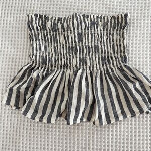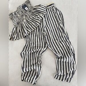This stylish set from Universal Thread features a classic black and white vertical stripe pattern, offering a timeless appeal. The strapless design with a smocked top and peplum ruffle at the waist creates a flattering silhouette, while the relaxed-fit tapered pants with an elastic waistband ensure comfort. Ideal for warm weather, its lightweight linen fabric makes it a perfect choice for sunny days.