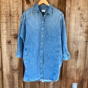 Stylish denim mini dress. Button-down front. Long sleeves. Casual and chic.