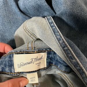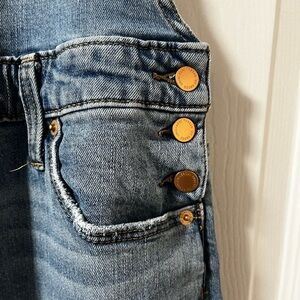 Chic denim overalls with adjustable straps. Front pocket and side button details. Versatile and comfortable for everyday wear.
