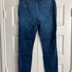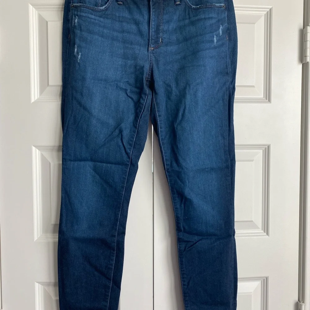 These Universal Thread jeans feature a classic denim blue color with a medium to dark wash. Designed in a high rise style, they offer a slim fit that tapers from hip to ankle, providing a sleek silhouette.